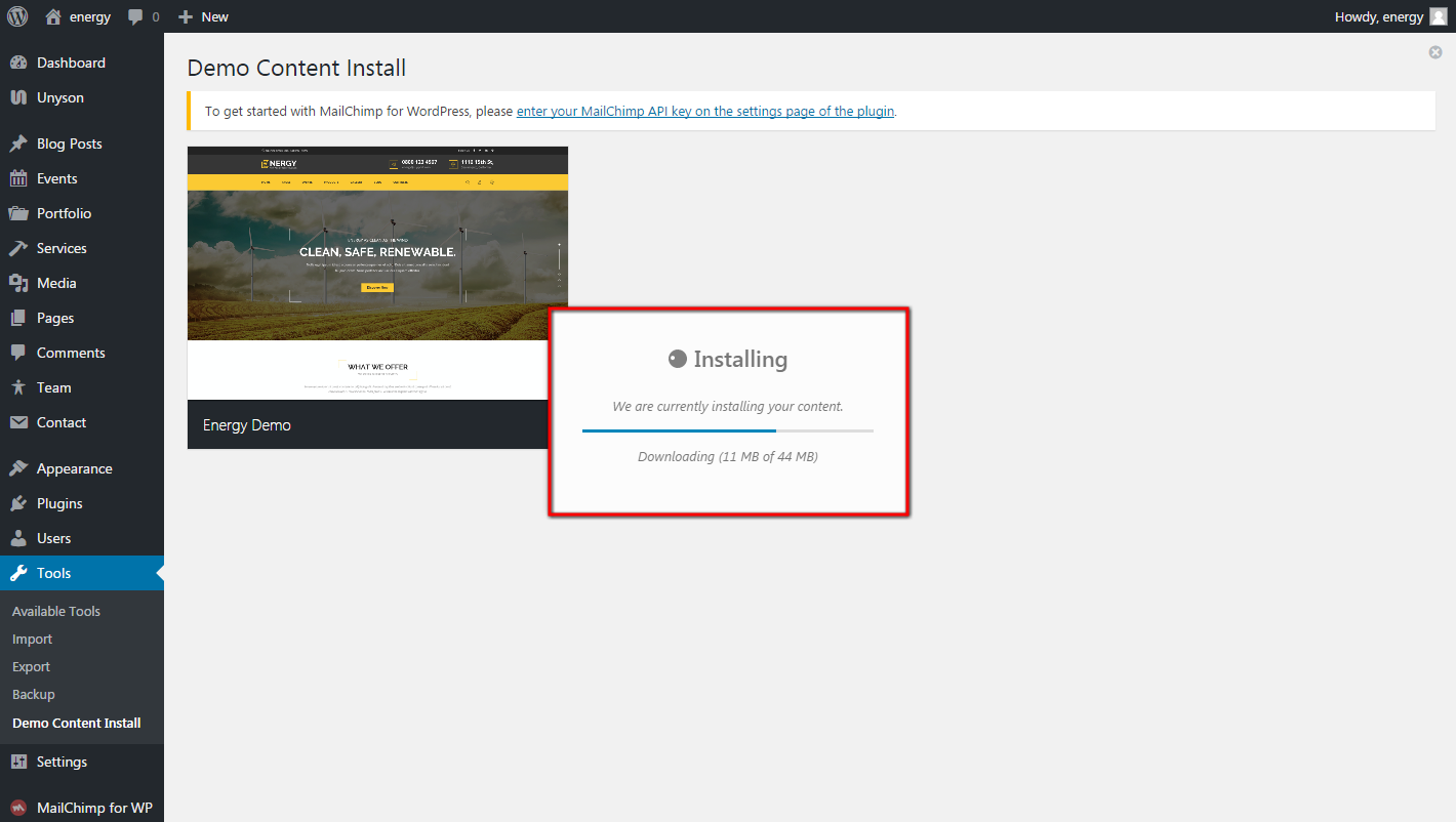 9. Then click "Install" button. This is very important: After demo content installation all your existing content will be overwritten!