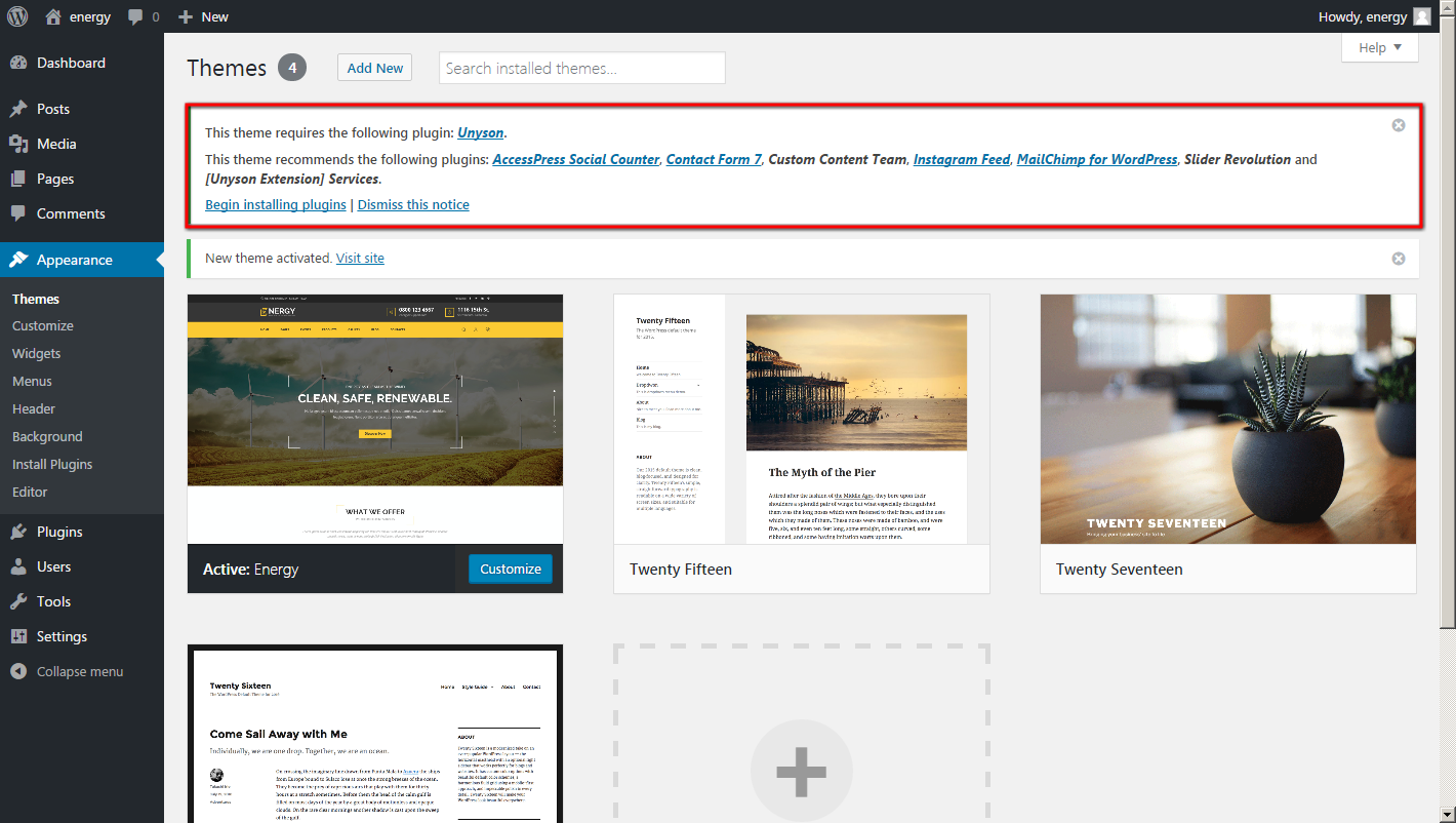 5. Click "Activate theme". After the theme is activated, you will be prompted to install recommended plugins: Unyson, AccessPress Social Counter, Contact Form 7, Easy Digital Downloads, Essential Grid, Instagram Feed, MailChimp for WordPress, Revolution Slider, Shortcodes in Menus, Tiled Galleries Carousel Without Jetpack, Widget CSS Classes, [Unyson Extensions] Services. Below on the screenshot you may view the list of plugins which is necessary to install. Click "Begin installing plugins":