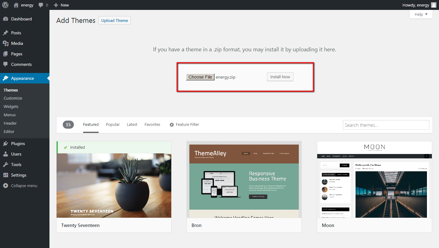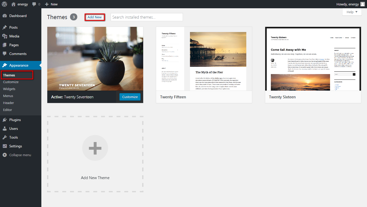 1. Go to your WordPress Dashboard is finished, click "Appearance" > "Themes" > "Add New":