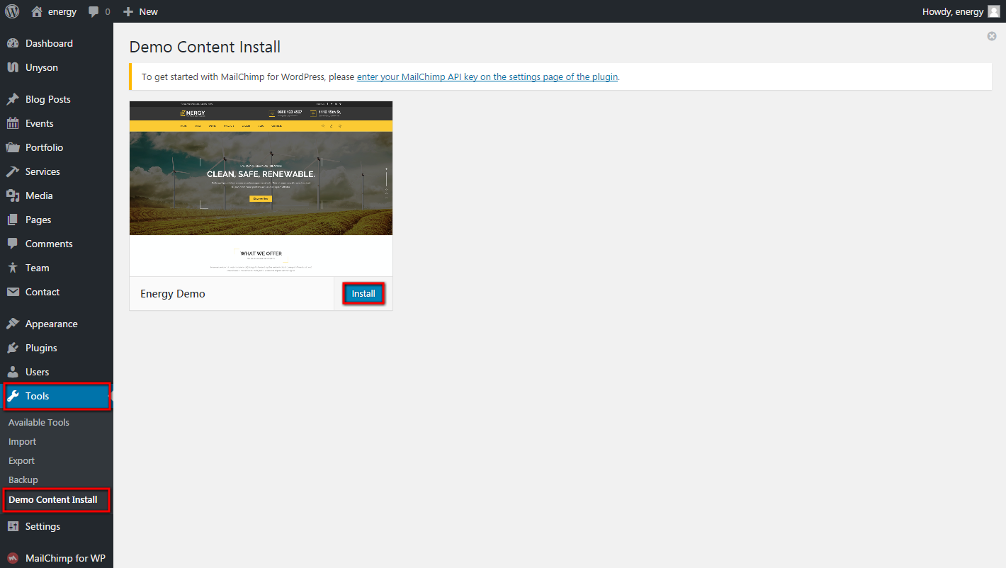 9. Then click "Install" button. This is very important: After demo content installation all your existing content will be overwritten!