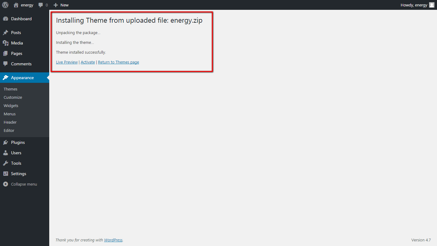 4. Theme installation begins. After theme installation is finished you will see this message: